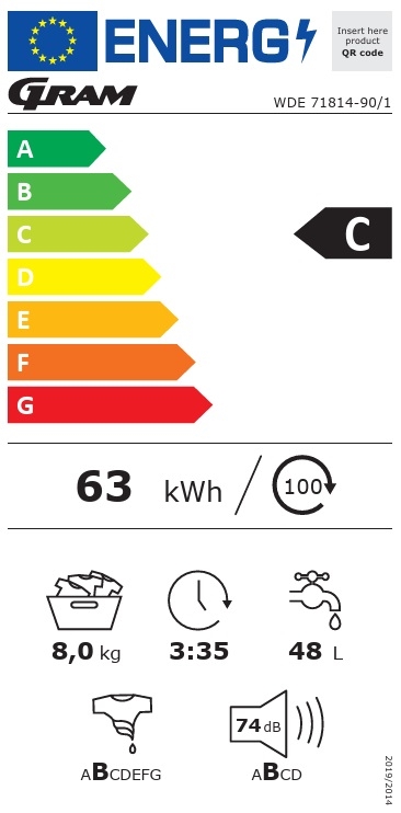Dejlig, nem og overskuelig vaskemaskine med 8 kg kapacitet, ekstra stor lugeåbning og god centrifugeringsevne på 1400 omdrejninger fra kvalitets mærket Gram. Gram WDE 71814-90/1 er en god maskine til daglig eller hyppig vask. Den har en kulfri invertermotor som sikrer støjsvag vask samt  høj levetid. Med sit energimærke C er Gram WDE 71814-90/1 designet til at sikre et energibesparende og miljøvenligt forbrug, der skåner tøjet og giver lækre resultater.